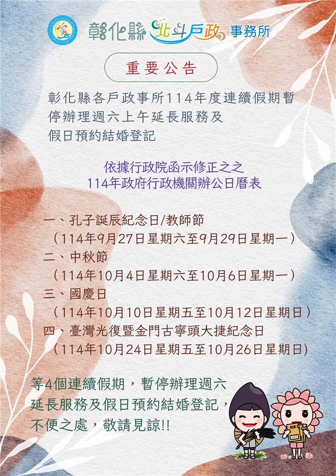其他資訊 【重要公告】~~本縣各戶政事務所於114年9月27日至29日、10月4日至6日、10月10日至12日、10月24日至26日等4個連續假期,暫停辦理週六延長服務及預約結婚登記服務,不便之處,敬請見諒!! 公佈日期: 2025/06/21 | 修改日期: 2025/06/21 | 瀏覽人次: 47人 | 聯絡電話: 劉雅芳 分機8882779 【重要公告】~~本縣各戶政事務所於114年9月27日至29日、10月4日至6日、10月10日至12日、10月24日至26日等4個連續假期,暫停辦理週六延長服務及預約結婚登記服務,不便之處,敬請見諒!! 為配合行政院修正114年政府行政機關辦公日曆表,本縣各戶政事務所於新增之2個連續假期(孔子誕辰紀念日及臺灣光復暨金門古寧頭大捷紀念日)期間,週六上午延長服務與假日預約結婚登記服務暫停。 依行政院函示修正之之114年政府行政機關辦公日曆表,本年度下半年增加2個連續3日假期,包括: (一) 孔子誕辰紀念日/教師節(114年9月27日星期六至9月29日星期一)。 (二) 臺灣光復暨金門古寧頭大捷紀念日(114年10月24日星期五至10月26日星期日)。 為政府機關提供服務一致性,爰本縣各戶政事務所於114年9月27日及10月25日之週六上午延長服務暫停1次。 另上開新增之連續假期期間,假日預約結婚登記服務亦同步暫停。