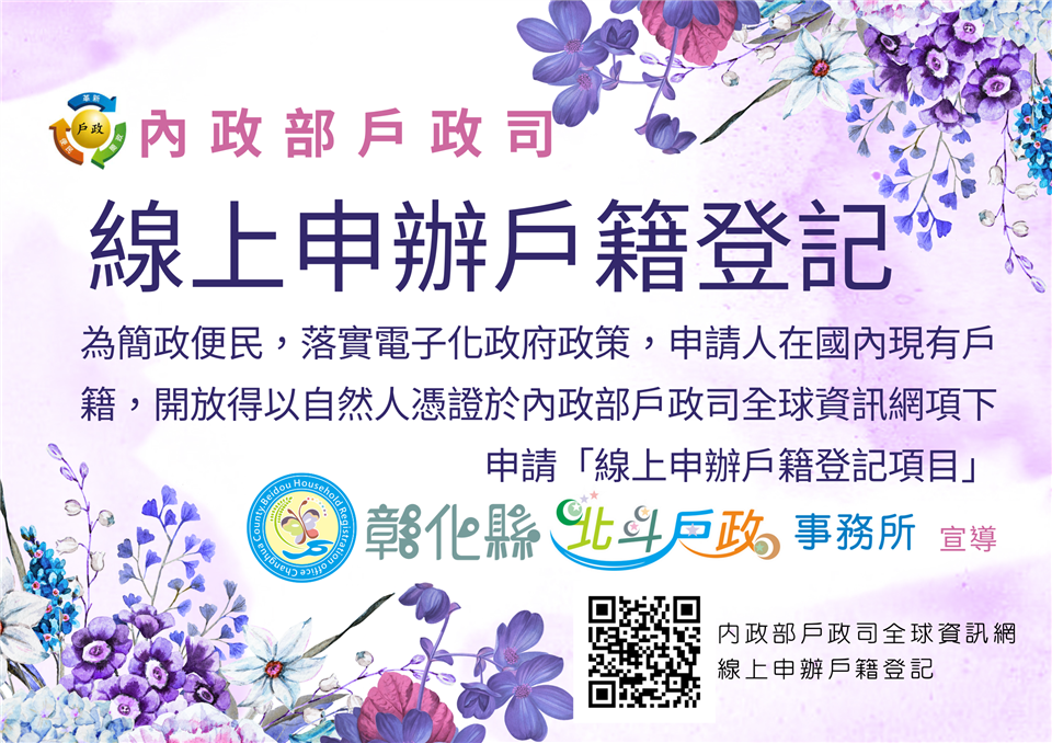 其他資訊 內政部戶政司全球資訊網已開放多項戶籍登記事項得以線上申辦戶籍登記,只要符合申辦資格,備妥自然人憑證及相關文件,就可在家上網申辦!省時又便利! 狀態: 歷史訊息 | 公佈日期: 2025/09/08 | 修改日期: 2025/09/08 | 瀏覽人次: 126人 | 聯絡電話: 劉雅芳 分機8882779 ✅內政部戶政司全球資訊網已開放多項戶籍登記事項得以線上申辦戶籍登記,只要符合申辦資格,備妥自然人憑證及相關文件,就可在家上網申辦!省時又便利!