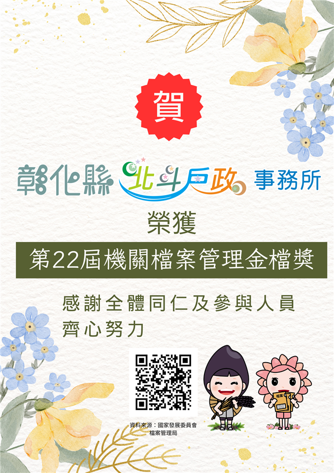 其他資訊 🥳賀~* 【彰化縣北斗戶政事務所】 🎊榮獲第22屆機關檔案管理金檔獎 公佈日期: 2025/09/15 | 修改日期: 2025/09/15 | 瀏覽人次: 196人 | 聯絡電話: 劉雅芳 分機8882779 🥳賀~*【彰化縣北斗戶政事務所】 🎊榮獲第22屆機關檔案管理金檔獎
