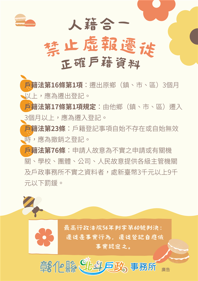 最新訊息 【人籍合一,禁止虛報遷徙,正確戶籍資料】 彰化縣北斗戶政事務所 關心您 公佈日期: 2025/09/19 | 修改日期: 2025/09/19 | 瀏覽人次: 90人 | 聯絡電話: 劉雅芳 分機8882779 【人籍合一,禁止虛報遷徙,正確戶籍資料】 彰化縣北斗戶政事務所 關心您戶籍法第16條第1項:遷出原鄉(鎮、市、區)3個月以上,應為遷出登記。戶籍法第17條第1項規定:由他鄉(鎮、市、區)遷入3個月以上,應為遷入登記。戶籍法第23條:戶籍登記事項自始不存在或自始無效時,應為撤銷之登記。戶籍法第76條:申請人故意為不實之申請或有關機關、學校、團體、公司、人民故意提供各級主管機關及戶政事務所不實之資料者,處新臺幣3千元以上9千元以下罰鍰。