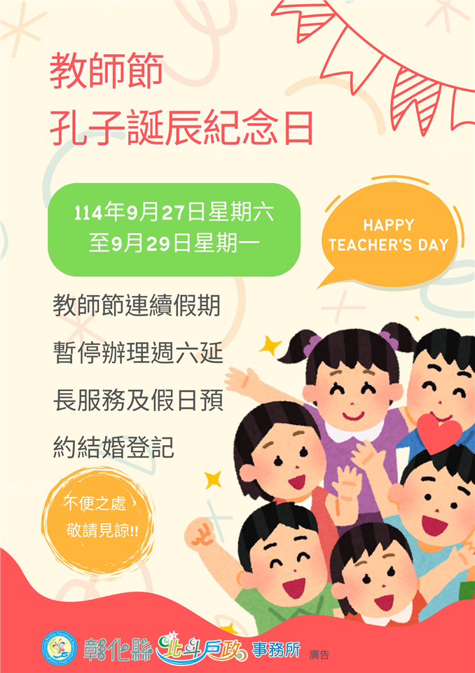 其他資訊 教師節 (孔子誕辰紀念日 )114年9月27日星期六 至9月29日星期一連續假期,暫停辦理週六延長服務及假日預約結婚登記,不便之處,敬請見諒!! 公佈日期: 2025/09/22 | 修改日期: 2025/09/22 | 瀏覽人次: 15人 | 聯絡電話: 劉雅芳 分機8882779 教師節 (孔子誕辰紀念日 )連續假期,暫停辦理週六延長服務及假日預約結婚登記,不便之處,敬請見諒!! ★若有結婚登記需求,建議可於結婚登記日 #前三個辦公日內,向戶政事務所辦理結婚登記,並指定結婚登記日。