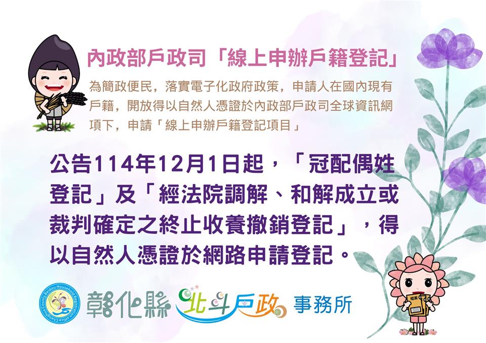 其他資訊 內政部公告自114年12月1日起,戶政司全球資訊網線上申辦戶籍登記新增「冠配偶姓登記」及「經法院調解、和解成立或裁判確定之收養撤銷登記」,得由民眾以自然人憑證於網路申請登記 公佈日期: 2025/12/25 | 修改日期: 2025/12/25 | 瀏覽人次: 29人 | 聯絡電話: 劉雅芳 分機8882779 內政部公告自114年12月1日起,戶政司全球資訊網線上申辦戶籍登記新增「冠配偶姓登記」及「經法院調解、和解成立或裁判確定之收養撤銷登記」,得由民眾以自然人憑證於網路申請登記 👍戶政司全球資訊網已開放多項戶籍登記事項得以線上申辦戶籍登記,只要符合申辦資格,備妥自然人憑證及相關文件,就可在家上網申辦!省時又便利!