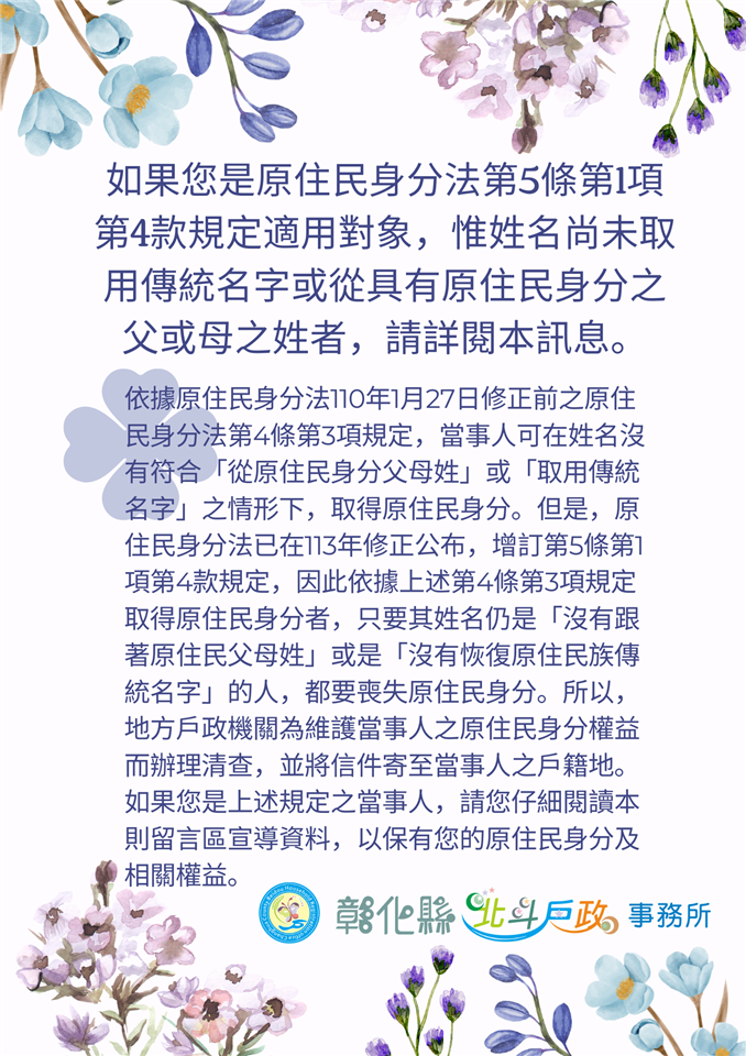 最新訊息 如果您是原住民身分法第5條第1項第4款規定適用對象,惟姓名尚未取用傳統名字或從具有原住民身分之父或母之姓者,請詳閱本訊息。 公佈日期: 2026/02/05 | 修改日期: 2026/02/05 | 瀏覽人次: 15人 | 聯絡電話: 劉雅芳 分機8882779 如果您是原住民身分法第5條第1項第4款規定適用對象,惟姓名尚未取用傳統名字或從具有原住民身分之父或母之姓者,請詳閱本訊息。依據原住民身分法110年1月27日修正前之原住民身分法第4條第3項規定,當事人可在姓名沒有符合「從原住民身分父母姓」或「取用傳統名字」之情形下,取得原住民身分。但是,原住民身分法已在113年修正公布,增訂第5條第1項第4款規定,因此依據上述第4條第3項規定取得原住民身分者,只要其姓名仍是「沒有跟著原住民父母姓」或是「沒有恢復原住民族傳統名字」的人,都要喪失原住民身分。所以,地方戶政機關為維護當事人之原住民身分權益而辦理清查,並將信件寄至當事人之戶籍地。如果您是上述規定之當事人,請您仔細閱讀本宣導資料(附件),以保有您的原住民身分及相關權益。