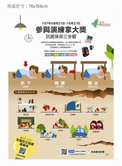 其他資訊 臺灣抗災演練網:只要做出抗震保命3步驟:趴下(Drop)、掩護(Cover)、穩住(Hold on),並拍照上傳至臺灣抗災演練網,即可參加抽獎,獎項包含iPad mini等大獎,立即上線演練與參加! 狀態: 歷史訊息 | 公佈日期: 2018/09/06 | 修改日期: 2018/09/06 | 瀏覽人次: 109人 臺灣抗災演練網:只要做出抗震保命3步驟:趴下(Drop)、掩護(Cover)、穩住(Hold on),並拍照上傳至臺灣抗災演練網,即可參加抽獎,獎項包含iPad mini等大獎,立即上線演練與參加!