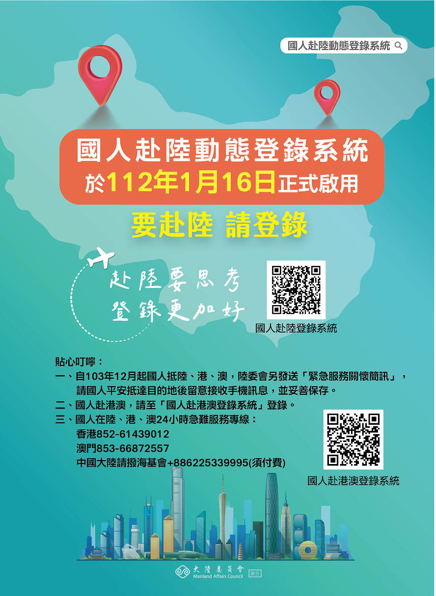 其他資訊 國人赴大陸地區動態登錄系統於112年1月16日正式啟用,赴陸要思考,登錄更加好。 公佈日期: 2023/02/10 | 修改日期: 2023/02/10 | 瀏覽人次: 249人 | 聯絡電話: 黃佳惠 7266813分機103 國人赴大陸地區動態登錄系統於112年1月16日正式啟用。 網址:國人赴大陸地區動態登錄系統