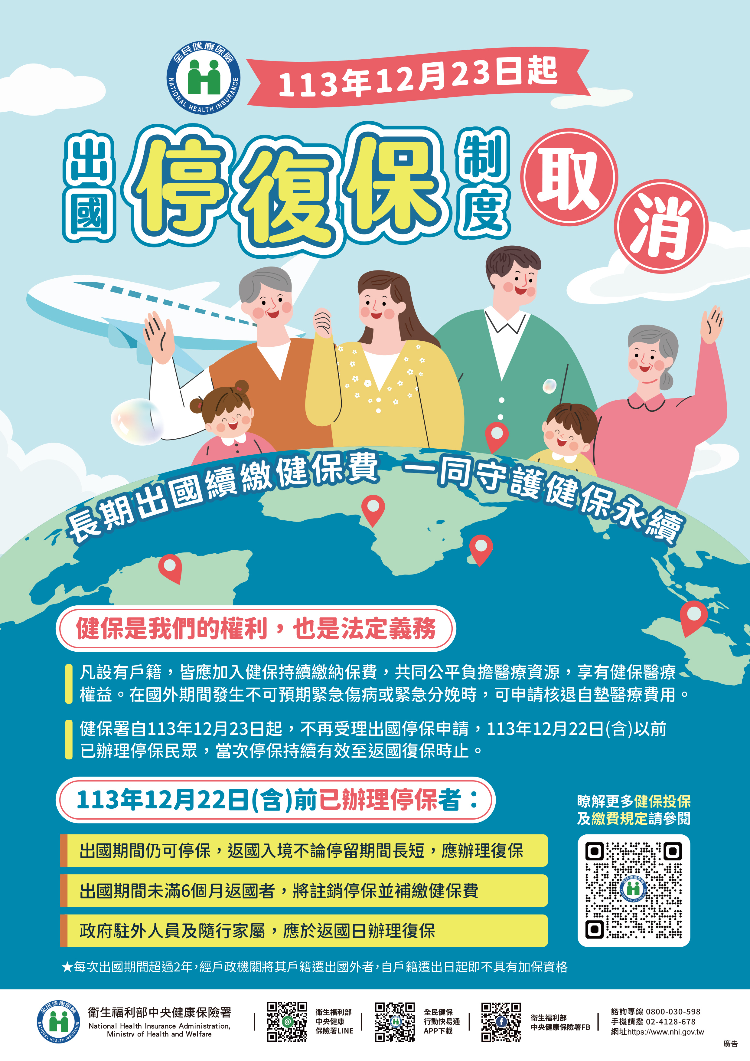 最新訊息 「衛生福利部中央健康保險署因應113年12月23日修正發布之全民健康保險法施行細則,自是日起取消出國停復保規定。」 公佈日期: 2024/12/30 | 修改日期: 2024/12/30 | 瀏覽人次: 254人 | 聯絡電話: 吳昶璋 7266813分機107 相關宣導單張及問答集,置於該署全球資訊網/ 重要政策/停復保規定變革專區。(https://www.nhi.gov.tw/ch/cp-17713-e61af-3873-1.html)