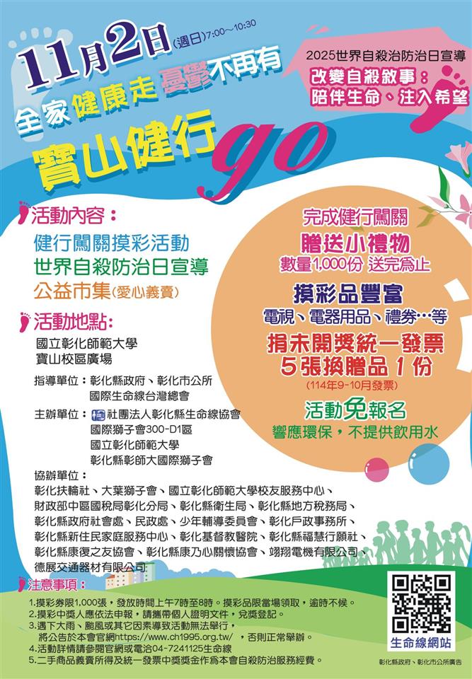 最新訊息 本所參與「2025世界自殺防治日宣導暨健行活動」,辦理戶政業務宣導及按讚有獎享好禮。 公佈日期: 2025/10/15 | 修改日期: 2025/10/14 | 瀏覽人次: 24人 | 聯絡電話: 李映萱 7266813分機103 彰化縣生命線協會11月2日將在國立彰化師範大學寶山校區(彰化市師大路2號)舉辦「2025世界自殺防治日宣導暨健行活動」~改變自殺敘事,陪伴生命、注入希望。 本所為深化服務工作、主動瞭解轄區民眾之需求,加強各項為民服務措施及政策宣導,將於11月2日(星期日)上午7時30分起,在彰師大寶山校區活動會場,辦理戶政業務宣導服務。 現場備有戶政文宣資料供民眾取閱,為讓鄉親更加瞭解戶政業務,同時舉辦「有獎徵答」及「按讚有禮」活動,獎品豐富,數量有限,敬請把握,歡迎鄉親作伙來參與。