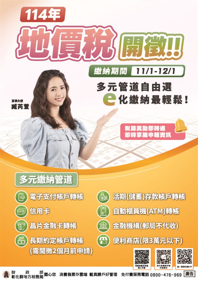 最新訊息 [轉知]114年地價稅於11月開徵,繳納期間自11月1日至12月1日,請如期繳納,彰化縣地方稅務局關心您。 公佈日期: 2025/11/01 | 修改日期: 2025/10/31 | 瀏覽人次: 14人 | 聯絡電話: 吳瑾婷 7266813分機120 [轉知]114年地價稅於11月開徵,繳納期間自11月1日至12月1日,請如期繳納,彰化縣地方稅務局關心您。彰化縣地方稅務局網站:https://www.changtax.gov.tw/彰化縣地方稅務局宣導影片:https://www.changtax.gov.tw/VideoListC002400.aspx?appname=VideoListC002400彰化縣地方稅務局粉絲專頁:https://www.facebook.com/ChangTax/?locale=zh_TW