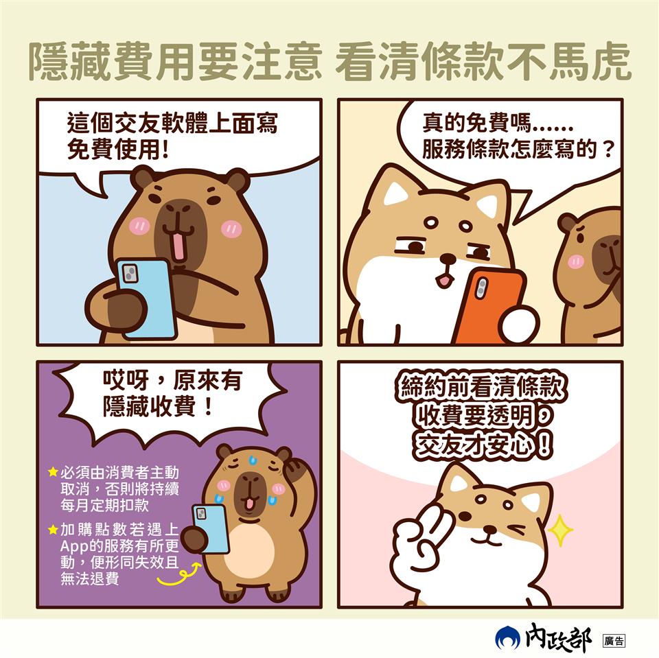 最新訊息 內政部交友服務圖卡及影片宣導 公佈日期: 2025/11/28 | 修改日期: 2025/11/28 | 瀏覽人次: 31人 | 聯絡電話: 吳瑾婷 7266813分機120 提醒您使用交友服務要小心謹慎! 審慎辨識、注意交友服務相關權益,以維護自身消費安全!
