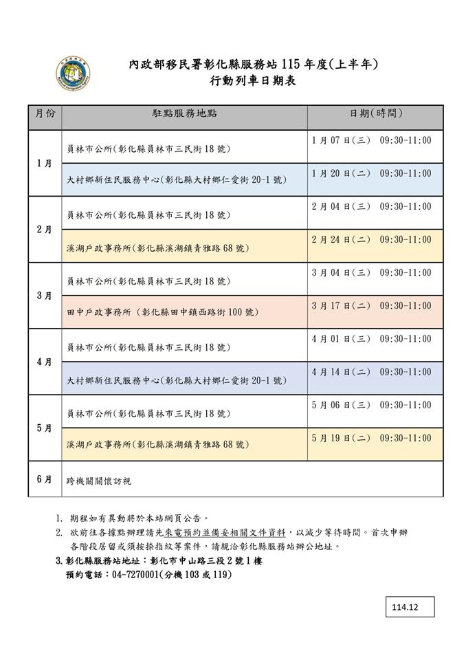 最新訊息 【宣導】內政部移民署中區事務大隊彰化縣服務站115年度「到府關懷宅配愛,擴大便民行動服務加值方案」上半年行動列車日期表。 公佈日期: 2025/12/19 | 修改日期: 2025/12/17 | 瀏覽人次: 8人 | 聯絡電話: 黃詩雅 7266813分機124
