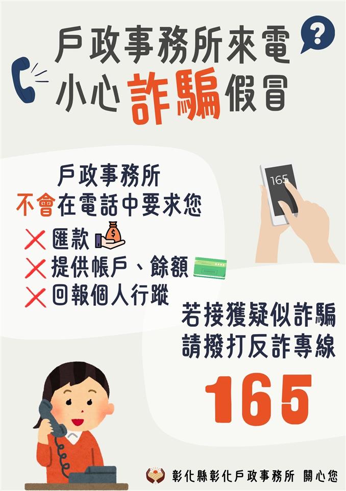 最新訊息 【反詐騙宣導】慎防假冒戶政事務所來電詐騙,謊稱有人冒辦戶政業務,請勿依來電指示操作和透露帳戶或個資 公佈日期: 2026/01/16 | 修改日期: 2026/01/15 | 瀏覽人次: 7人 | 聯絡電話: 李映萱 7266813分機103 近期發現有不肖人士假冒「戶政事務所」名義致電民眾,藉故套取個人資料或進行詐騙行為,提醒民眾提高警覺,注意以下事項: 一、戶政事務所不會在電話中要求您: 1.匯款或轉帳 2.提供銀行帳戶或帳戶餘額 3.回報個人行蹤 如接獲自稱戶政事務所人員來電,並出現上述情形,極可能為詐騙,請勿依指示操作。 二、遇到疑似詐騙情形,請這樣做: 1.先聽對方說什麼內容,但不提供個人資料或與對方多作交談 2.立即掛斷電話,不要相信對方轉接電話 3.撥打165反詐騙專線查證 📢 提醒您:防詐三原則「不匯款、不提供、不回應」,共同守護自身財產與個人資料安全。