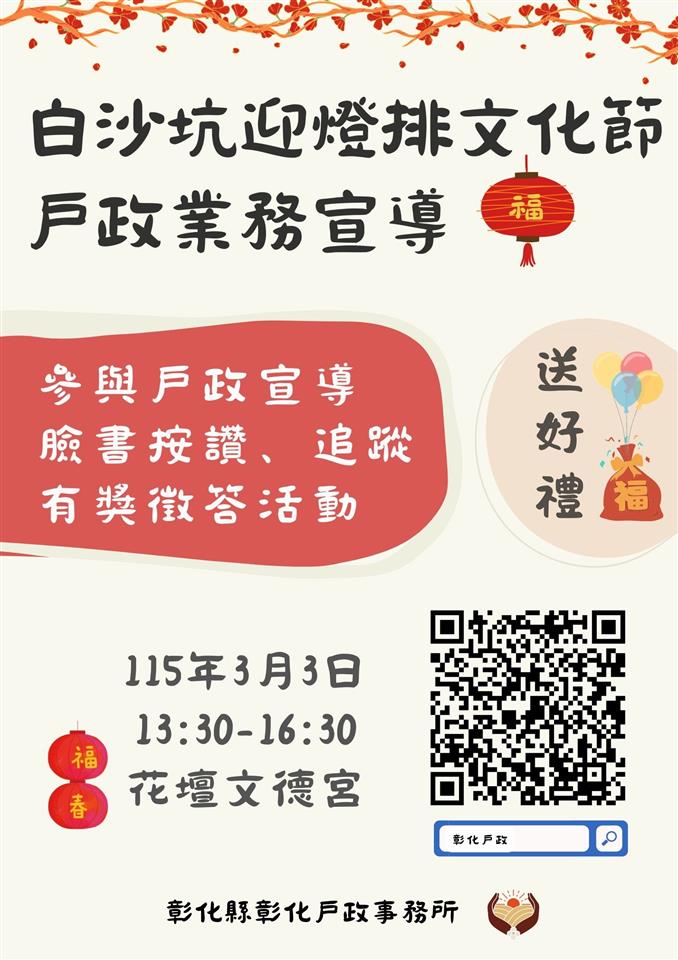 最新訊息 本所參與「2026白沙坑迎燈排文化節」,辦理「按讚有獎享好禮」活動 公佈日期: 2026/02/25 | 修改日期: 2026/02/25 | 瀏覽人次: 7人 | 聯絡電話: 李映萱 7266813分機103 本所為深化服務工作、主動瞭解轄區民眾之需求,加強各項為民服務措施及政策宣導,將於3月3日(星期二)下午1時30分起,在彰化縣花壇鄉文德宮活動會場,辦理戶政業務宣導服務。 現場備有戶政文宣資料供民眾取閱,為讓鄉親更加瞭解戶政業務,同時舉辦「有獎徵答」及「按讚分享有禮」活動,獎品豐富,數量有限,敬請把握,歡迎鄉親作伙來參與。