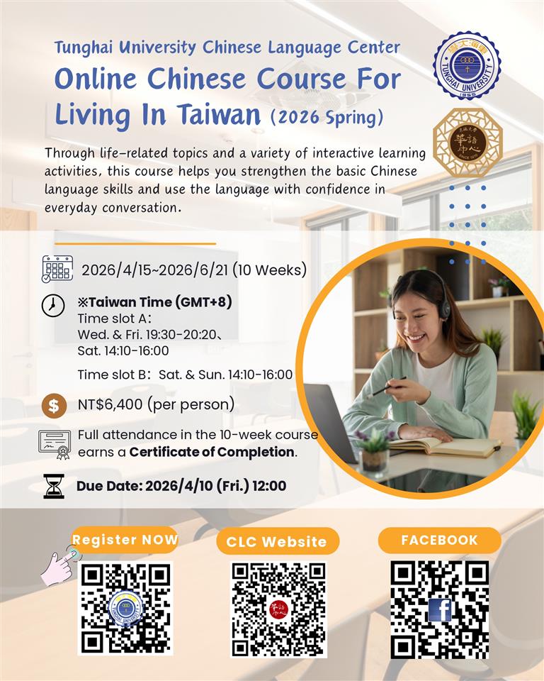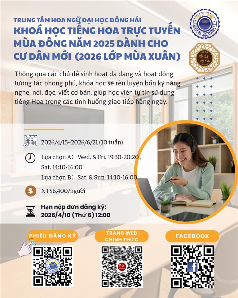 最新訊息 【轉知】東海大學華語中心辦理「2026年春季新住民線上華語課」招生資訊 公佈日期: 2026/04/01 | 修改日期: 2026/03/30 | 瀏覽人次: 7人 | 聯絡電話: 黃詩雅 7266813分機124 一、為提升本國新住民之華語文能力以適應在臺生活環境,東海大學華語中心提供「新住民線上華語課程」,並以日常生活及工作等為主題,幫助新住民在日常情境中自信地使用華語進行溝通。二、本案聯絡人:朱珮瑜,電話:(04)2359-0121分機30127。