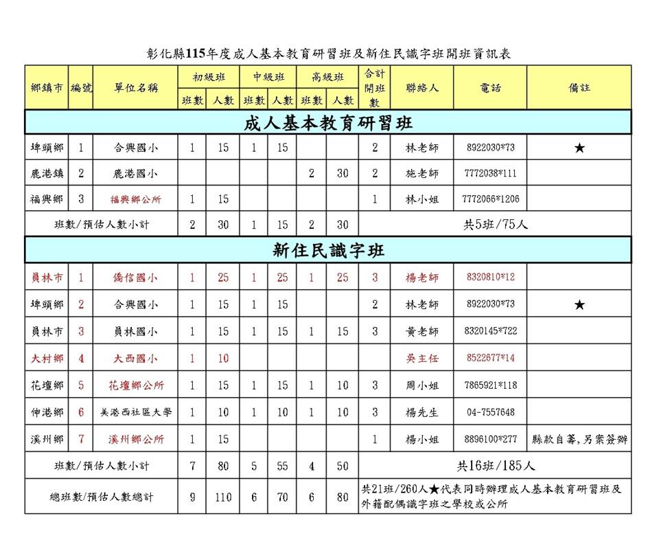 最新訊息 彰化縣115年度成人基本教育研習班及新住民識字班開班資訊。 公佈日期: 2026/04/17 | 修改日期: 2026/04/15 | 瀏覽人次: 29人 | 聯絡電話: 黃詩雅 7266813分機124 歡迎有意願之國民及新住民朋友逕向開課單位洽詢報名參加。