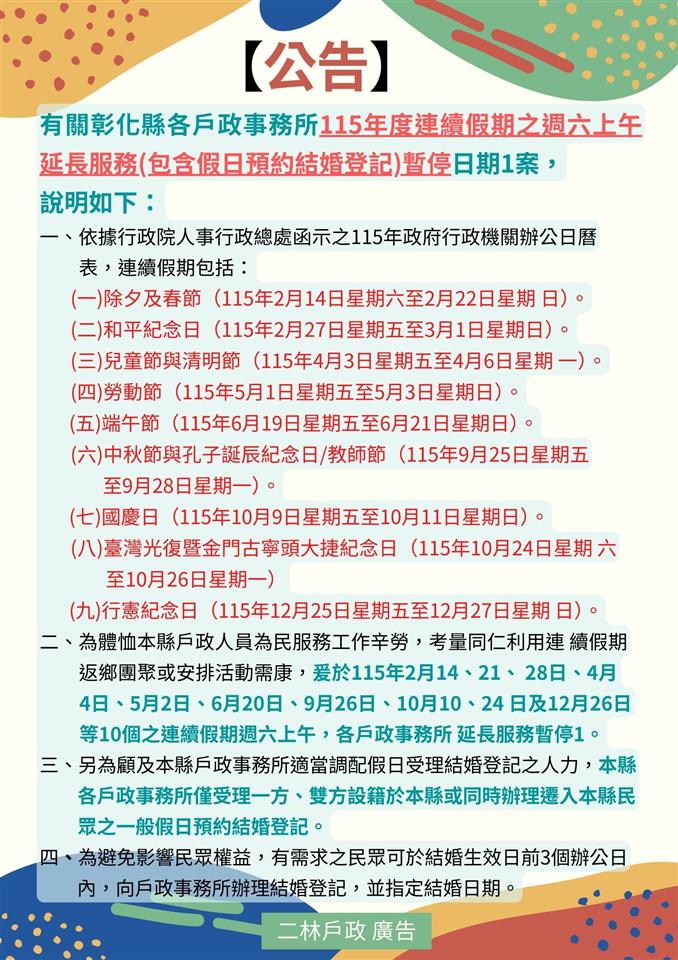 最新訊息 【公告】本縣各戶政事務所明(115)年度連續假期之週六上午延長服務與假日預約結婚登記服務暫停日期。 公佈日期: 2025/12/22 | 修改日期: 2025/12/22 | 瀏覽人次: 14人 | 聯絡電話: 湯惠婷 8960683分機215