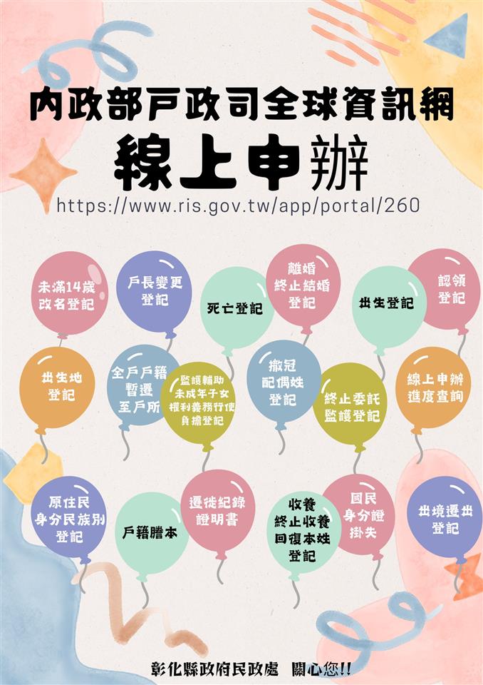 最新訊息 內政部戶政司全球資訊網已開放多項戶籍登記事項得以線上申辦戶籍登記,請多加利用! 公佈日期: 2025/01/02 | 修改日期: 2023/02/23 | 瀏覽人次: 982人 | 聯絡電話: 鐘菁霞 分機7554321#15 內政部戶政司全球資訊網已開放多項戶籍登記事項得以線上申辦戶籍登記,請多加利用!