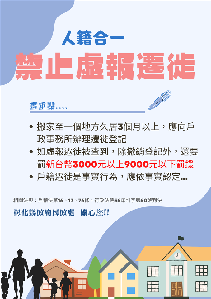 最新訊息 【宣導】~~遷徙登記應依居住事實審認,以符合人籍合 一原則,並正確戶籍資料。 公佈日期: 2025/01/02 | 修改日期: 2023/03/14 | 瀏覽人次: 762人 | 聯絡電話: 鐘菁霞 分機7554321#15 ※戶籍法第16條第1項規定:「遷出原鄉(鎮、市、區)3個月以上,應為遷出登記。」 ※戶籍法第17條第1項規定:「由他鄉(鎮、市、區)遷入3個月以上,應為遷入登記。」 ※戶籍法第23條規定:「戶籍登記事項自始不存在或自始無效時,應為撤銷之登記。」 ※戶籍法第76條規定:「申請人故意為不實之申請或有關機關、學校、團體、公司、人民故意提供各級主管機關及戶政事務所不實之資料者,處新臺幣3千元以上9千元以下罰鍰。」 ※最高行政法院56年判字第60號判決:「遷徙是事實行為,遷徙登記自應依事實認定之。」