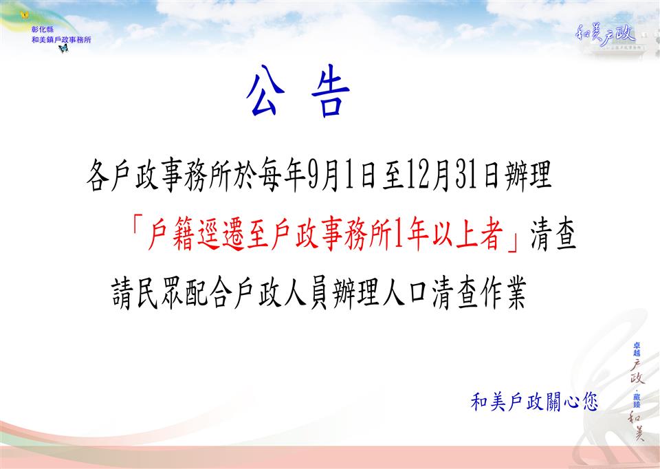 最新訊息 各戶政事務所於每年9月1日至12月31日辦理「戶籍逕遷至戶政事務所1年以上者」之戶籍狀況,請民眾配合戶政人員辦理人口清查作業,以落實戶籍登記,維護國民權益。 狀態: 歷史訊息 | 公佈日期: 2025/09/05 | 修改日期: 2023/09/06 | 瀏覽人次: 95人 | 聯絡電話: 鐘菁霞 分機7554321#15 各戶政事務所於每年9月1日至12月31日辦理「戶籍逕遷至戶政事務所1年以上者」之戶籍狀況,請民眾配合戶政人員辦理人口清查作業,以落實戶籍登記,維護國民權益。
