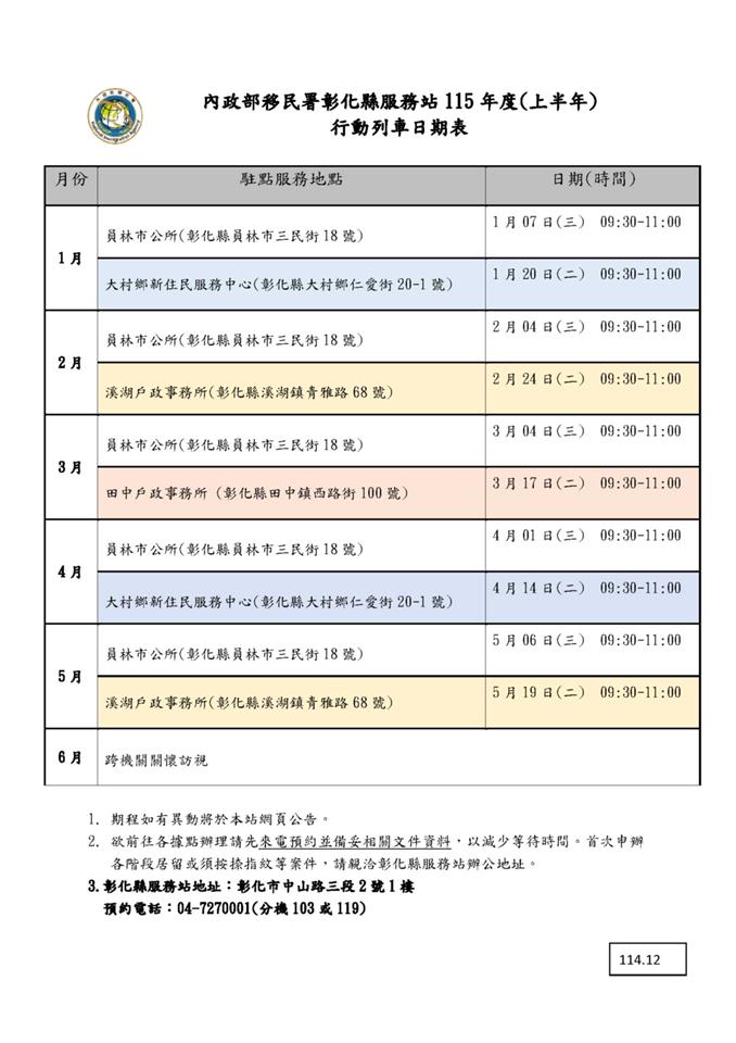 最新訊息 115年度「到府關懷宅配愛,擴大便民行動服務加值方案」上半年行動服務列車行程,請新住民多加運用!~~!移民署中區事務大隊彰化縣服務站關心您! 公佈日期: 2025/12/15 | 修改日期: 2025/05/15 | 瀏覽人次: 74人 | 聯絡電話: 鐘菁霞 分機7554321#15 115年度「到府關懷宅配愛,擴大便民行動服務加值方案」上半年行動服務列車行程,請新住民多加運用!~~移民署中區事務大隊彰化縣服務站關心您!