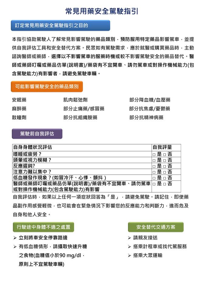 最新訊息 交通部公路局「常見用藥安全駕駛指引」! 公佈日期: 2025/08/19 | 修改日期: 2025/08/19 | 瀏覽人次: 22人 | 聯絡電話: 鐘菁霞 分機7554321#15 鑑於社會各界關注駕駛人服用藥物後可能影響駕車安全課題,交通部於114年6月26日召開「駕駛人醫學諮詢會第15次委員會」,就國人常用之藥品,徵詢專家意見制定旨揭指引。