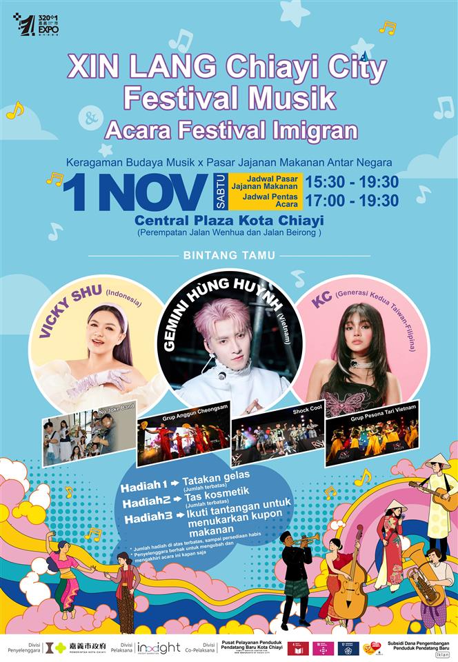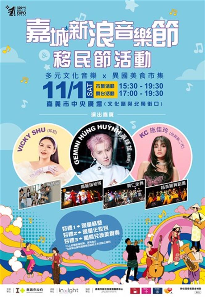 最新訊息 【轉知】114年11月1日(星期六)嘉義市政府舉辦114年度「嘉城新浪音樂節暨移民節活動」,請踴躍參加。 公佈日期: 2025/10/20 | 修改日期: 2025/10/20 | 瀏覽人次: 17人 | 聯絡電話: 鐘菁霞 分機7554321#15 1.本活動將於於114年11月1日(星期六)15時30分開始,至19時30分閉幕,地點為嘉義市中央廣場(文化路與北榮街口)舉行。2.本活動邀請黃輝雄、KC施佳玲等來自越南、印尼的異國歌手、新住民及新二代表演團體,以音樂舞蹈的交流形式進行異國音樂文化演出, 並設置異國美食文創市集攤位,推動多元族群共融,,屆時歡迎民眾共襄盛舉。
