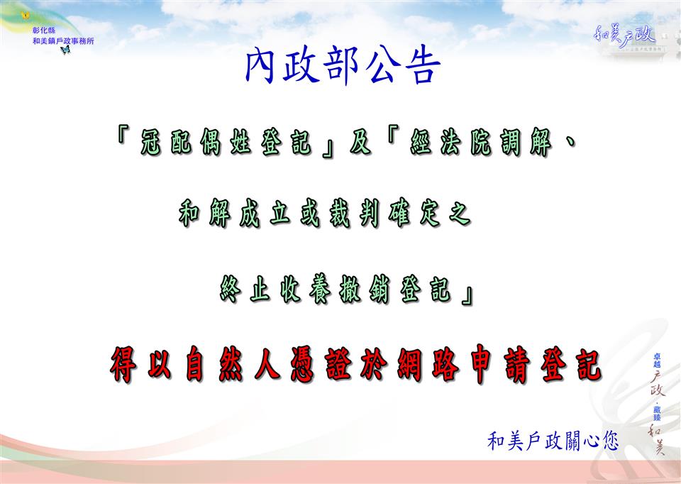 最新訊息 內政部公告「冠配偶姓登記」及「經法院調解、和解成立或裁判確定之終止收養撤銷登記」,得由民眾以自然人憑證於網路申請登記一案,自114年12月1日起實施。 公佈日期: 2025/12/03 | 修改日期: 2025/12/03 | 瀏覽人次: 33人 | 聯絡電話: 鐘菁霞 分機7554321#15 內政部公告「冠配偶姓登記」及「經法院調解、和解成立或裁判確定之終止收養撤銷登記」,得由民眾以自然人憑證於網路申請登記一案,自114年12月1日起實施。