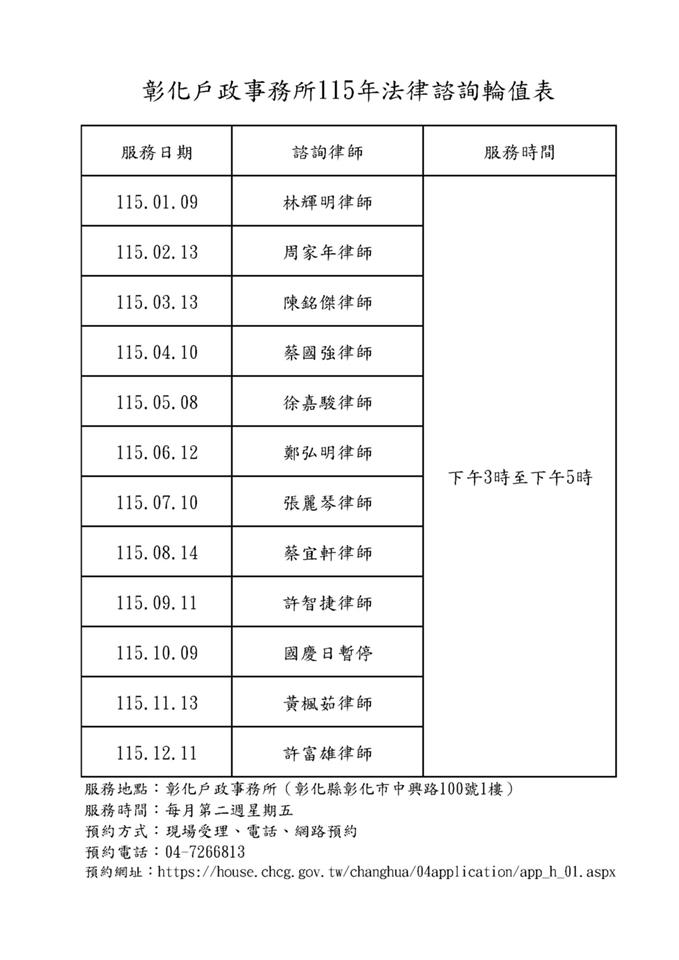 最新訊息 彰化縣彰化戶政事務所115年法律諮詢輪值表,敬請多加利用。 公佈日期: 2025/12/17 | 修改日期: 2025/12/17 | 瀏覽人次: 6人 | 聯絡電話: 鐘菁霞 分機7554321#15 彰化縣彰化戶政事務所115年法律諮詢輪值表,敬請多加利用。