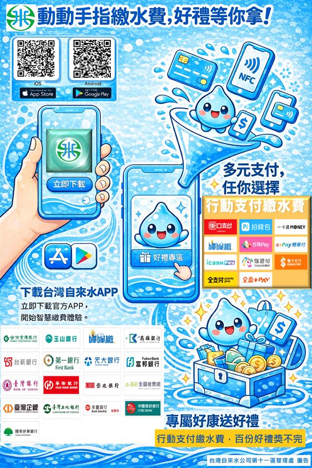 最新訊息 台灣自來水股份有限公司第十一區管理處辦理115年度「行動支付繳水費享好禮」抽獎活動,請踴躍參加!! 公佈日期: 2026/01/21 | 修改日期: 2026/01/21 | 瀏覽人次: 9人 | 聯絡電話: 鐘菁霞 分機7554321#15 台灣自來水股份有限公司第十一區管理處辦理115年度「行動支付繳水費享好禮」抽獎活動,請踴躍參加!!