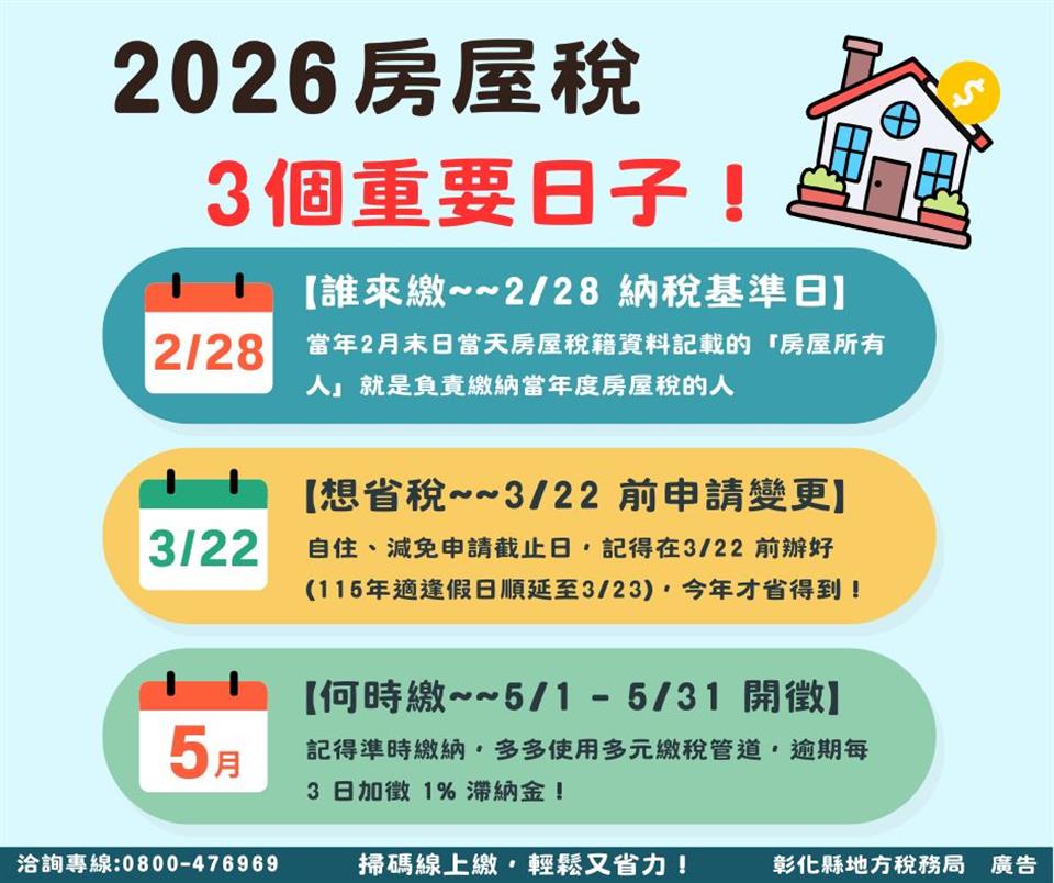 最新訊息 「2026房屋稅3個關鍵日」~~ 公佈日期: 2026/02/13 | 修改日期: 2026/02/13 | 瀏覽人次: 6人 | 聯絡電話: 鐘菁霞 分機7554321#15 1、每年2月28日為房屋稅納稅義務基準日,由房屋所有人負責繳納當年房屋稅。2、符合房屋稅減免條件者,記得於115年3月23日前提出申請,當期即可適用優惠稅率。3、每年5月房屋稅繳納期間,記得善用多元繳稅管道省時又便利。