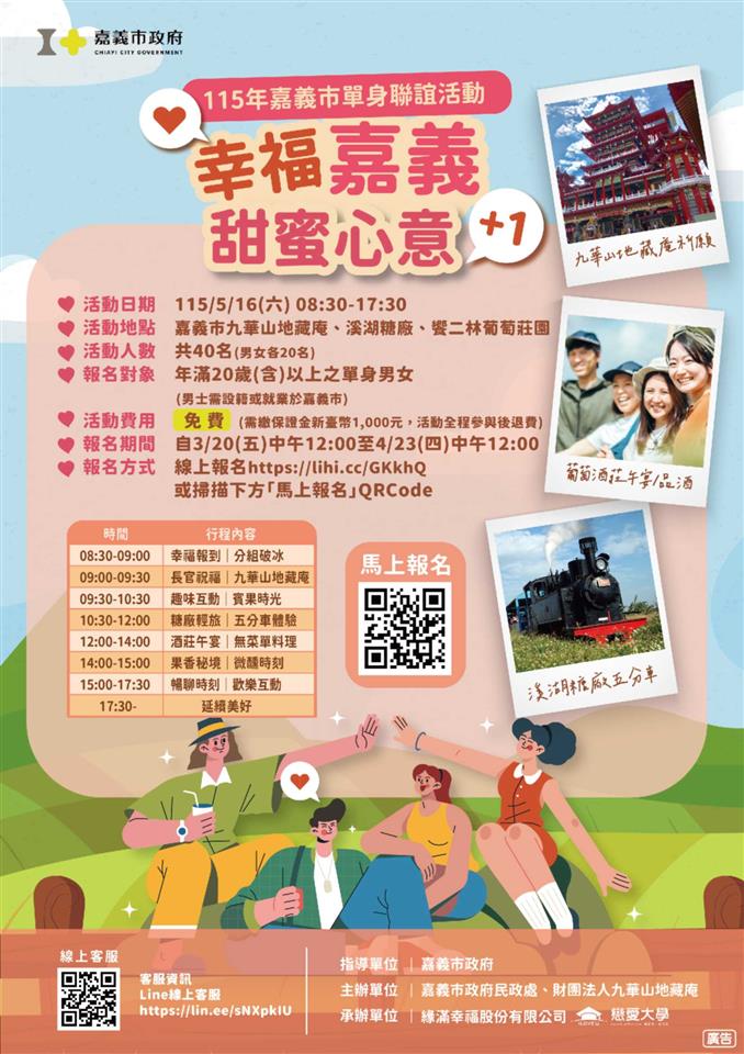 最新訊息 嘉義市政府與財團法人九華山地藏庵訂於115年5月16日聯合舉辦115年「幸福嘉義・甜蜜心意+1」單身聯誼活動,敬請單身男女多多參與。 公佈日期: 2026/03/16 | 修改日期: 2026/03/16 | 瀏覽人次: 17人 | 聯絡電話: 鐘菁霞 分機7554321#15 一、為提升嘉義市婚育率,鼓勵單身民眾擴大社交生活領 域,提倡正當休閒活動,增加彼此互動交往認識機會,爰 規劃旨揭活動。 二、請協助宣導並鼓勵單身朋友踴躍參與,旨揭活動相關資訊 如附宣傳單(線上報名網址:https://lihi.cc/GKkhQ;報 名期間:自115年3月20日中午12時起至115年4月23日中午 12時止)。