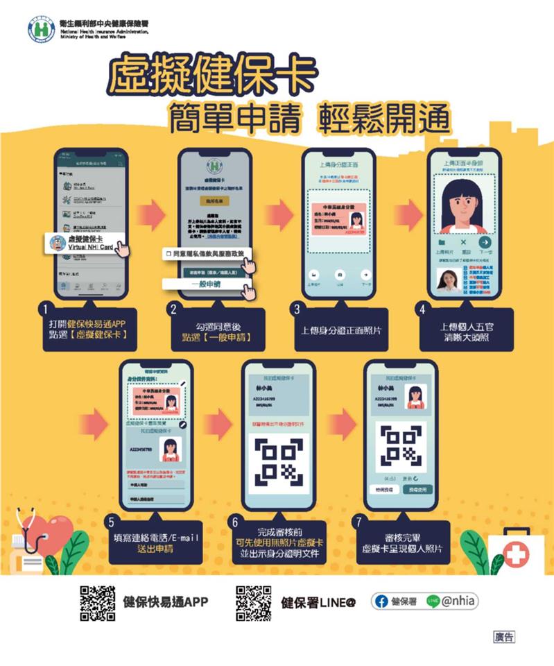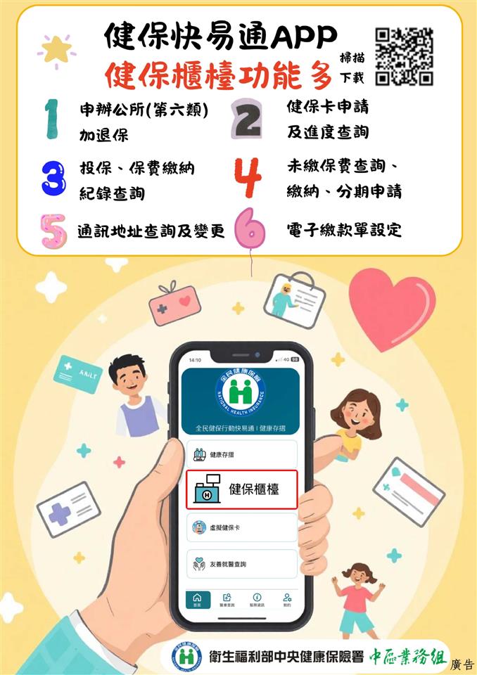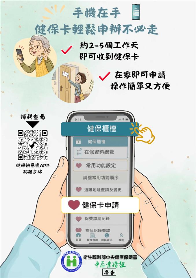 最新訊息 『健保快易通APP健保櫃檯功能多』!『虛擬健保卡簡單申請輕鬆開通』!『手機在手健保卡申辦輕鬆不必走』! 公佈日期: 2026/03/24 | 修改日期: 2026/03/24 | 瀏覽人次: 4人 | 聯絡電話: 鐘菁霞 分機7554321#15 『健保快易通APP健保櫃檯功能多』!『虛擬健保卡簡單申請輕鬆開通』!『手機在手健保卡申辦輕鬆不必走』!