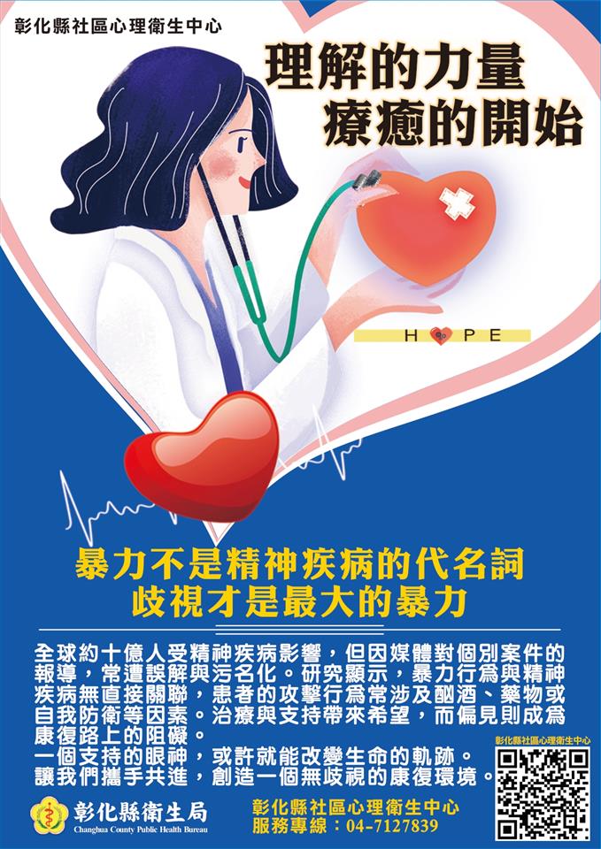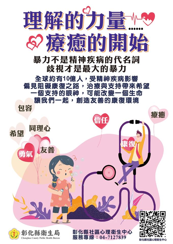 最新訊息 理解的力量,療癒的開始,暴力不是精神疾病的開始,歧視才是最大的暴力~~讓社區心理諮商陪伴照顧你我的心!! 彰化縣衛生局關心您!! 公佈日期: 2026/04/24 | 修改日期: 2026/04/24 | 瀏覽人次: 19人 | 聯絡電話: 鐘菁霞 分機7554321#15 理解的力量,療癒的開始,暴力不是精神疾病的開始,歧視才是最大的暴力!人生卡關有危機時,轉機不在高樓-水域裡,轉轉心情,由我們接住您!珍愛生命守門人1問2應3轉介 !您的心事我來守護,免付費安心專線1925!讓社區心理諮商陪伴照顧你我的心!! 彰化縣衛生局關心您彰化縣社區心理衛生中心https://center.chshb.gov.tw/彰化縣衛生局https://www.facebook.com/share/1E2fKaoNC3/?mibextid=LQQJ4d【113年度彰化縣第17屆「元氣滿滿,讓愛啟航」天使盃暨推動心理健康活動】https://www.facebook.com/share/p/14xTNVScdf/?mibextid=WC7FNe【傷春悲秋?認識季節性情緒疾患】https://www.facebook.com/share/p/1UnTHDL6RS/?mibextid=WC7FNe【心理治療去汙名化:讓心理健康成為每個人的權利】https://www.facebook.com/share/p/1K9Az6t37V/?mibextid=WC7FNe社團法人彰化縣康復之友協會https://www.facebook.com/share/19PXFP28vP/?mibextid=LQQJ4d【113年秋季刊】https://www.facebook.com/share/p/17geELgRVb/?mibextid=WC7FNe心陽光會所https://www.facebook.com/heart1110601/好心安會所https://www.facebook.com/share/1Drz1P2R5B/?mibextid=LQQJ4d