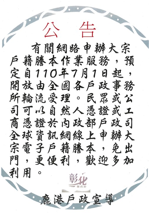 其他資訊 網路申辦大宗戶籍謄本作業服務,預定自110年7月1日起,開放由全國各戶政事務所輪流受理 公佈日期: 2021/08/05 | 修改日期: 2021/08/05 | 瀏覽人次: 147人 有關網路申辦大宗戶籍謄本作業服務,預定自110年7月1日起,開放由全國各戶政事務所輪流受理。民眾或公司可以自然人憑證或工商憑證於內政部戶政司全球資訊網線上申辦大宗電子戶籍謄本,免出門,更便利,歡迎多加利用