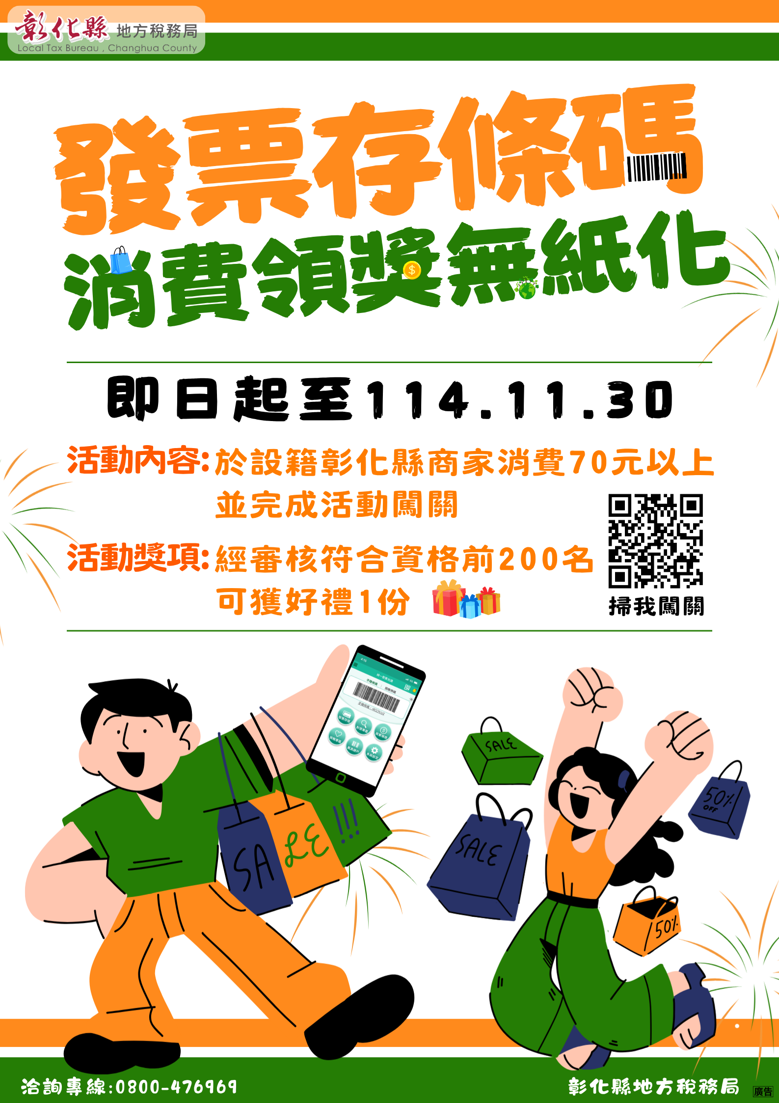 最新訊息 彰化縣地方稅務局舉辦「發票存條碼 消費領獎無紙化」活動 公佈日期: 2025/10/20 | 修改日期: 2025/10/20 | 瀏覽人次: 10人 | 聯絡電話: 許進雄 7773744分機15 即日起至114年11月30日止,於設籍彰化縣內之營業人商家消費70元以上,並完成活動表單任務,經本局審核符合資格前200名,即可獲好禮1份活動詳情請參閱活動網站(https://reurl.cc/Nxmvjn)、活動訊息或粉絲團查詢,或撥免費服務電話0800-476969洽詢。