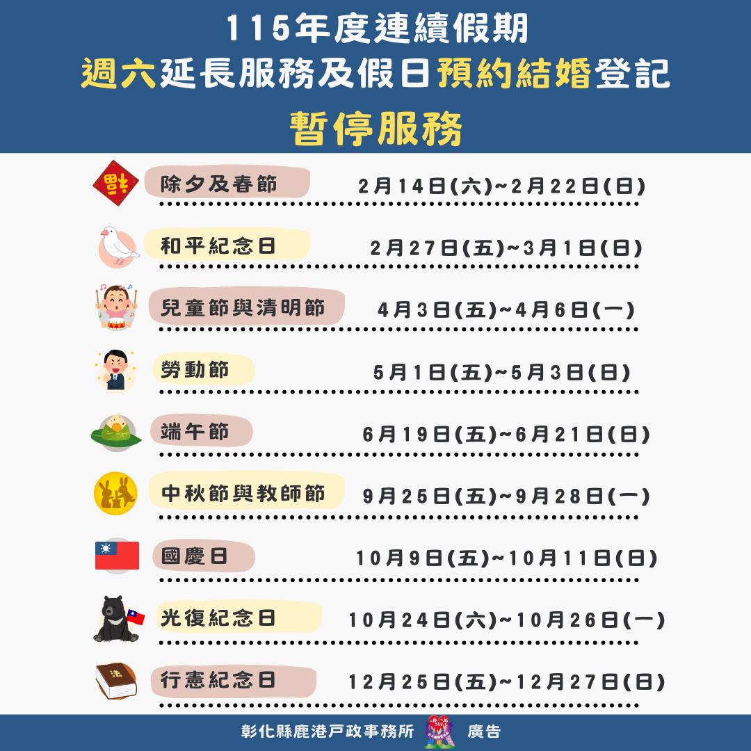 最新訊息 【公告】本縣各戶政事務所115年度連續假期暫停辦理週六上午延長服務與假日預約結婚登記服務。 公佈日期: 2025/12/23 | 修改日期: 2025/12/23 | 瀏覽人次: 185人 | 聯絡電話: 許進雄 7773744分機15 一、本縣各戶政事務所115年度連續假期暫停週六延長服務及假日預約結婚登記日期: (一)除夕及春節(115年2月14日星期六至2月22日星期日)。 (二) 和平紀念日(115年2月27日星期五至3月1日星期日)。 (三) 兒童節與清明節(115年4月3日星期五至4月6日星期一)。 (四) 勞動節(115年5月1日星期五至5月3日星期日)。 (五) 端午節(115年6月19日星期五至6月21日星期日)。 (六) 中秋節與孔子誕辰紀念日/教師節(115年9月25日星期五至9月28日星期一)。 (七) 國慶日(115年10月9日星期五至10月11日星期日)。 (八) 臺灣光復暨金門古寧頭大捷紀念日(115年10月24日星期六至10月26日星期一)。 (九) 行憲紀念日(115年12月25日星期五至12月27日星期日)。 二、115年2月14、21、28日、4月4日、5月2日、6月20日、9月26日、10月10、24日及12月26日等10個之連續假期週六上午,各戶政事務所延長服務暫停1次;另連假期間之假日預約結婚登記服務亦同步暫停。 三、本縣各戶政事務所週六延長服務為彰化、員林、和美、溪湖、二林、北斗、鹿港、田中8大中心戶政事務所提供服務。 四、結婚當事人可於結婚生效日前3個辦公日內,向戶政事所辦理結婚登記,並指定結婚日期。