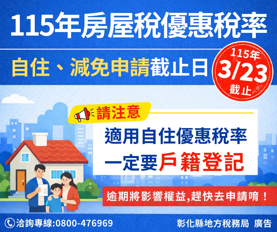 最新訊息 【宣導】房屋稅享優惠趁現在 公佈日期: 2026/03/05 | 修改日期: 2026/03/05 | 瀏覽人次: 24人 | 聯絡電話: 許進雄 7773744分機15 1、如欲享房屋稅自住優惠,請於115年3月23日前辦竣戶籍登記並提出申請,當期就能適用。2、115年房屋稅符合自住、減免條件者,請於115年3月23日前提出申請,守護權益輕鬆省。
