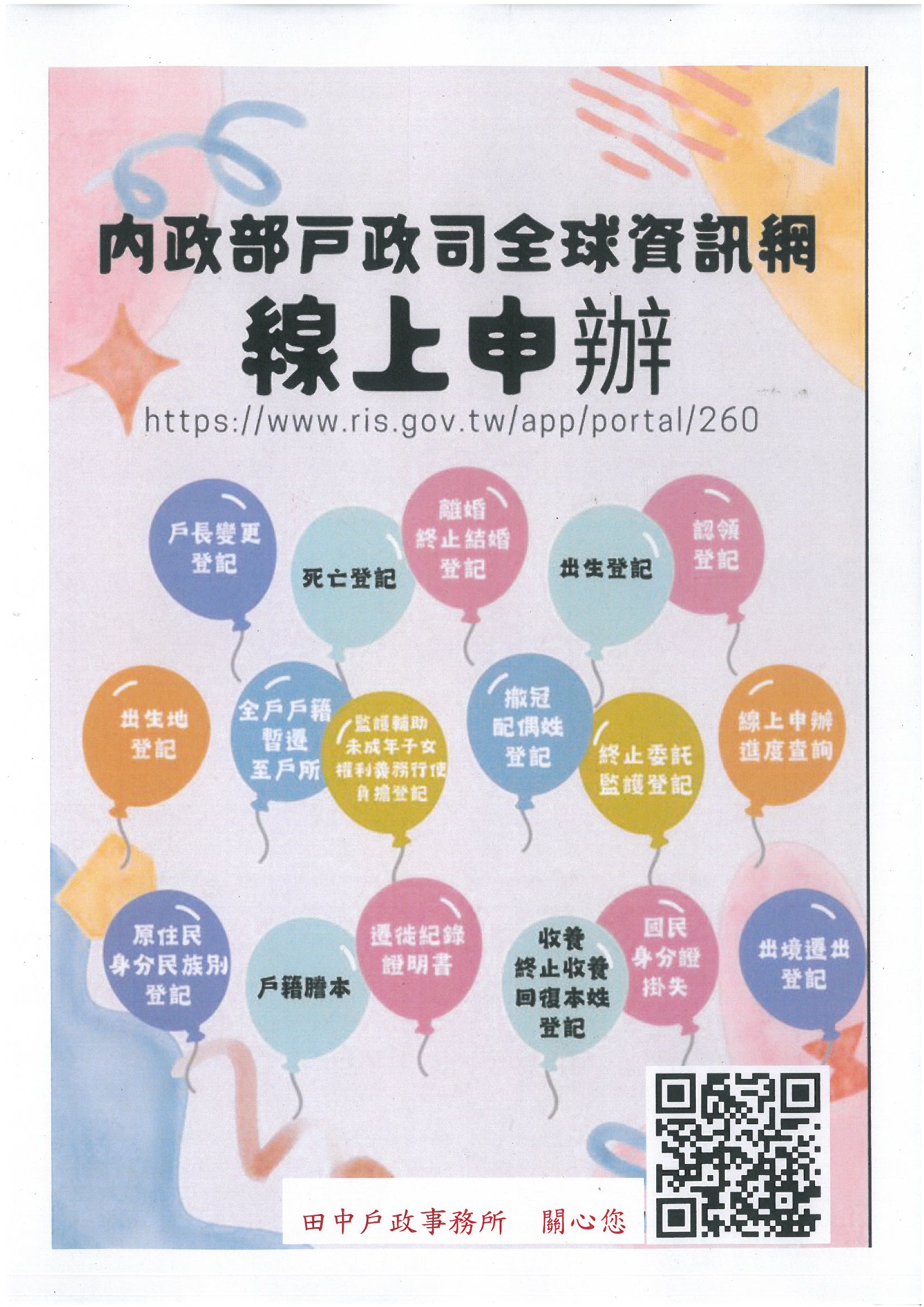 其他資訊 線上申辦戶籍登記宣導 公佈日期: 2023/01/17 | 修改日期: 2023/01/17 | 瀏覽人次: 35人 | 聯絡電話: 文柏涵 目前已陸續開放部分戶籍登記項目可線上申辦,請備齊自然人憑證及相關文件,上傳至內政部戶政司「線上申辦戶籍登記」網頁連結辦理(https://www.ris.gov.tw/app/portal/834) ~彰化縣田中戶政事務所關心您~
