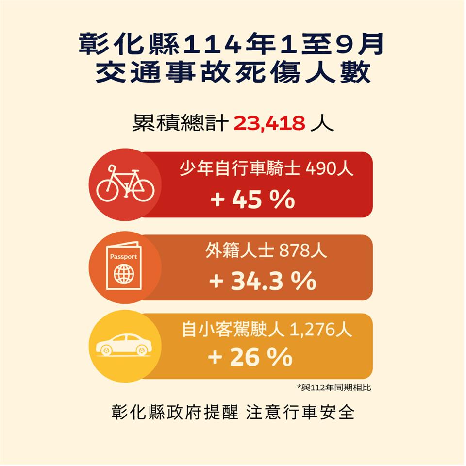 其他資訊 【宣導】~~114年1-9月道路交通事故死傷累計23,418人,分心騎車有風險,左轉停看更安全,彰化縣政府關心您! 公佈日期: 2025/12/24 | 修改日期: 2023/12/11 | 瀏覽人次: 93人 | 聯絡電話: 文柏涵 (04)8745657 (一)分心騎車有風險,左轉停看更安全。(二)At Unsignalized Intersections: Stop, Look, and Yield.(三)多一分禮讓,少一分遺憾,路口不搶快,安全自然來!