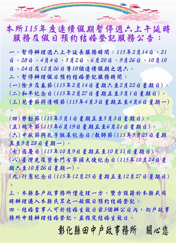 最新訊息 本所115年度連續假期暫停週六上午延時服務及假日預約結婚登記服務公告 公佈日期: 2025/12/23 | 修改日期: 2025/12/23 | 瀏覽人次: 28人 | 聯絡電話: 文柏涵 (04)8745657 一、暫停辦理週六上午延長服務時間:115年2月14日、2月21日、2月28日、4月4日、5月2日、6月20日、9月26日、10月10日、10月24日及12月26日連續假期之週六上午。二、暫停辦理假日預約結婚登記服務時間:(一)除夕及春節(115年2月14日星期六至2月22日星期日)。(二)和平紀念日(115年2月27日星期五至3月1日星期日)。(三)兒童節與清明節(115年4月3日星期五至4月6日星期一)。(四)勞動節(115年5月1日星期五至5月3日星期日)。(五)端午節(115年6月19日星期五至6月21日星期日)。(六)中秋節與孔子誕辰紀念日/教師節(115年9月25日星期五至9月28日星期一)。(七)國慶日(115年10月9日星期五至10月11日星期日)。(八)臺灣光復暨金門古寧頭大捷紀念日(115年10月24日星期六至10月26日星期一)。(九)行憲紀念日(115年12月25日星期五至12月27日星期日)。三、本縣各戶政事務所僅受理一方、雙方設籍於本縣或同時辦理遷入本縣民眾之一般假日預約結婚登記。四、結婚當事人可於結婚登記日前3個辦公日內,向戶政事務所申請辦理結婚登記,並指定結婚登記生效日。