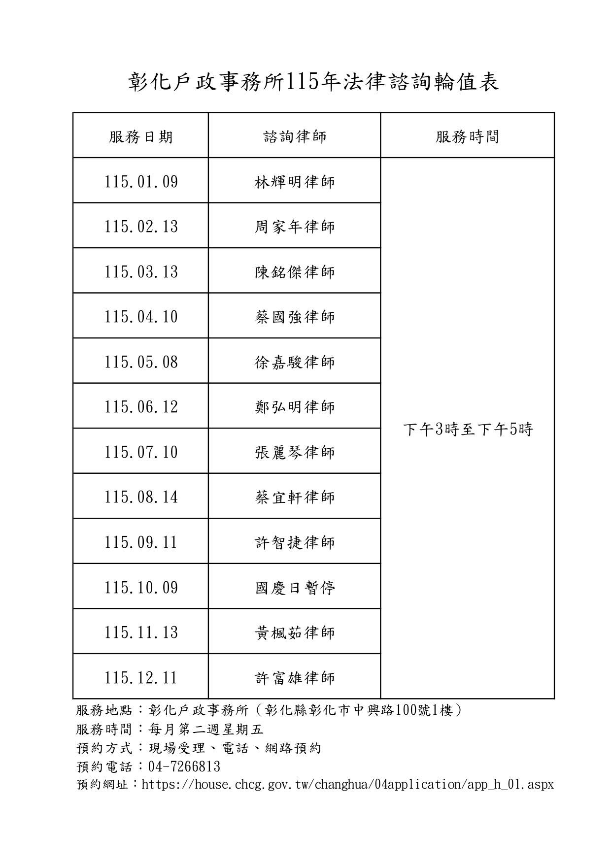 一般公告 【轉知】彰化戶政事務所115年法律諮詢輪值表 公佈日期: 2025/12/18 | 修改日期: 2025/12/18 | 瀏覽人次: 22人 彰化戶政事務所為提升為民服務品質,辦理法律諮詢服務。