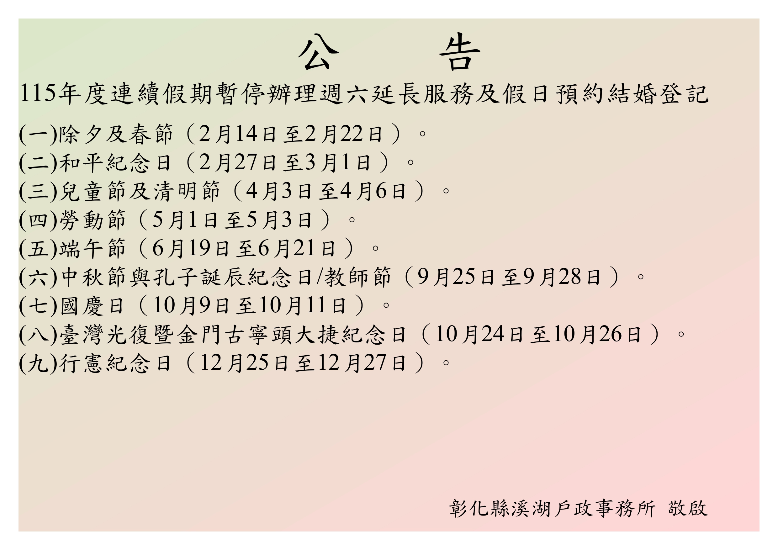 一般公告 本縣各戶政事務所115年度連續假期之週六上午延長服務與假日預約結婚登記服務暫停日期。 公佈日期: 2025/12/19 | 修改日期: 2025/12/19 | 瀏覽人次: 42人 本縣各戶政事務所115年度連續假期之週六上午延長服務與假日預約結婚登記服務暫停日期。