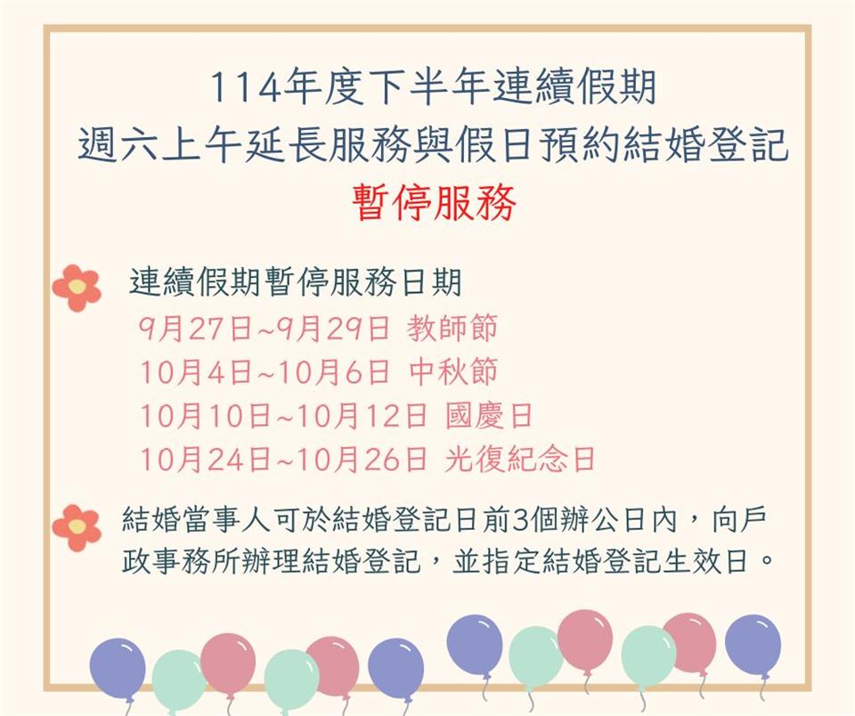 其他資訊 【公告】修正本縣各戶政事務所114年度下半年連續假期暫停辦理週六上午延長服務與假日預約結婚登記服務。 公佈日期: 2025/06/23 | 修改日期: 2025/06/23 | 瀏覽人次: 302人 一、為配合行政院修正114年政府行政機關辦公日曆表,本縣各戶政事務所下半年連續假期暫停週六延長服務及假日預約結婚登記日期: (一)孔子誕辰紀念日/教師節(114年9月27日星期六至9月29日星期一)。 (二)中秋節(114年10月4日星期六至10月6日星期一)。 (三)國慶日(114年10月10日星期五至10月12日星期日)。 (四)臺灣光復暨金門古寧頭大捷紀念日(114年10月24日星期五至10月26日星期日)。 二、114年9月27日、10月4日、10月11日、10月25日連續假期之週六上午,各戶政事務所延長服務暫停1次;另連假期間之假日預約結婚登記服務亦同步暫停。 三、本縣各戶政事務所週六延長服務為彰化、員林、和美、溪湖、二林、北斗、鹿港、田中8大中心戶政事務所提供服務。 四、本縣各戶政事務所僅受理一方、雙方設籍於本縣或同時辦理遷入本縣民眾之一般假日預約結婚登記。 五、結婚當事人可於結婚登記日前3個辦公日內,向戶政事所辦理結婚登記,並指定結婚登記生效日。