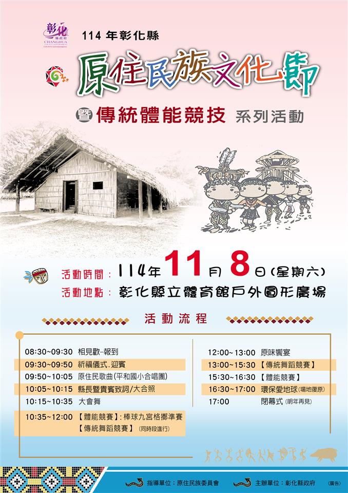 其他資訊 114年彰化縣原住民族文化節暨傳統體能競技系列活動(地點:彰化縣立體育館戶外圓形廣場)歡迎踴躍參加。 公佈日期: 2025/10/02 | 修改日期: 2025/10/02 | 瀏覽人次: 21人 彰化縣一年一度原住民族文化盛事「114年彰化縣原住民族文化節暨傳統體能競技系列活動」,訂於114年11月8日(星期六)在彰化縣立體育館戶外圓形廣場(彰化市健興路1號)舉辦,節目內容多元豐富,詳情請見彰化縣政府民政處網站(https://civil.chcg.gov.tw/03bulletin/bulletin03.aspx)及「彰化縣原住民生活館」臉書粉絲專頁(https://www.facebook.com/p/彰化縣原住民生活館-100064533528742/?locale=zh_TW)